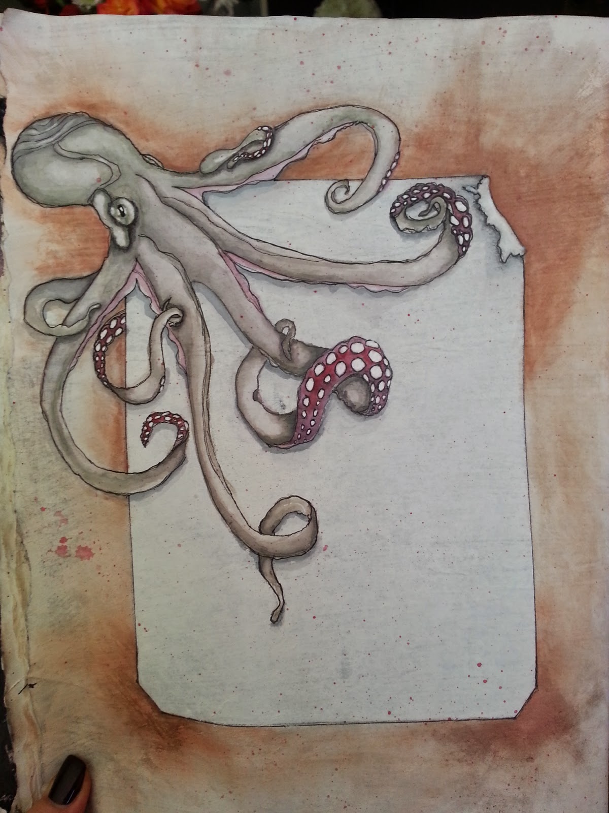 I have always loved the octopus' tentacles. There's something just delightful about the way they curl and move. The other side of this page is black. The white gesso nearly covered all of it. I did't want a pure white page so it worked nicely.